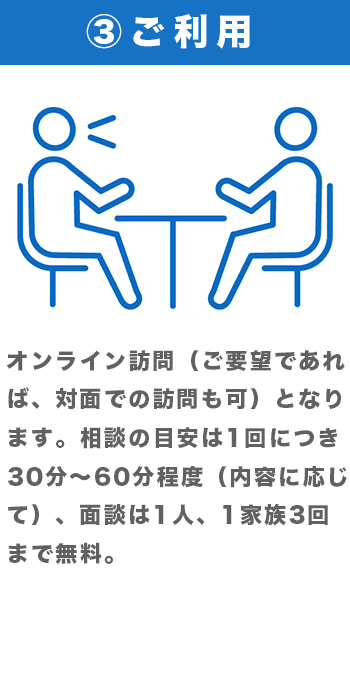 相談目安は1回につき30分~60分程度(内容に応じて)、面談は1人、1家族 3 回 まで無料です。